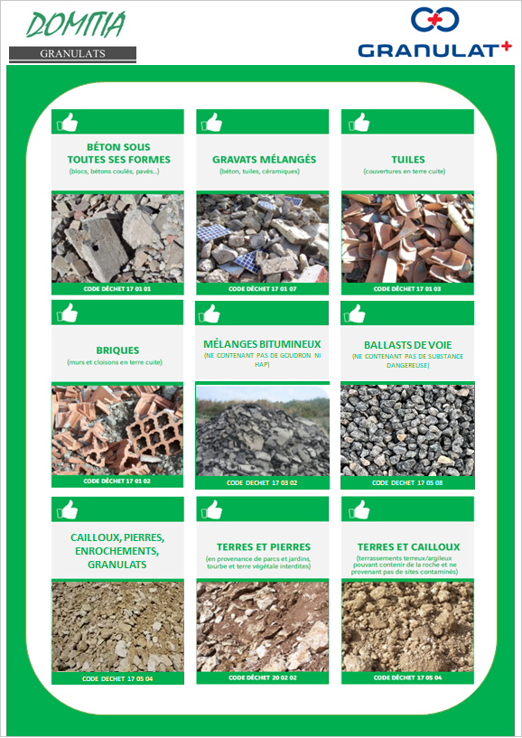Nous acceptons : briques, tuiles, céramiques, béton (ferraillé ou non ), cailloux, pierres, enrochements, granulats, terre, gravats mélangés, enrobés, mélanges bitumineux...