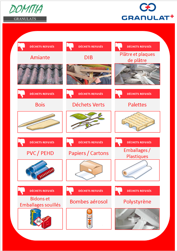 Nous n’acceptons pas : déchets plastiques, DIB, déchets verts, bois, amiante, plâtre et plaque de plâtre, polystyrène…